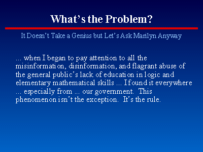 Is the analogy implied in the title of my presentation too strong? Can it be true that our own government is actually stabbing us in the back? Of course, it is easy to get carried away with rhetoric and overstate any case. However, let's take a look at what Marilyn Vos Savant has to say. As you may know, she is listed in the Guinness Book of World Records for highest IQ and is best known for her weekly "Ask Marilyn" column in Parade Magazine. This is a quotation from her book entitled "The Power of Logical Thinking" (p. 90).