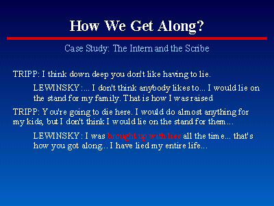 This exchange is from the transcript of one of Linda Tripp's recordings of her telephone conversations with Monica Lewinsky. It is generally understood to be moral to lie in certain circumstances. A commonly cited example is when the Nazis are at the door seeking victims of their inhumanity. Indeed, it has even been observed that small "white" lies are the grease that smooths social interaction, since the full truth may be less than pleasing to those engaged in any of the various forms of intercourse. However, as a widely known, respected, and admired spokesperson for young Americans, Monica's frank comments to her friend document how far our culture has strayed from the more pastoral time when a "man's word was his bond." Distasteful though it may be, she notes that lying what we do to get along. Indeed, she points out, that's what our parents teach us. Lying is ingrained as tacit knowledge in our cultural mores and beliefs.