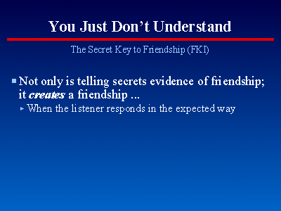 This is a quotation from page 98 of the 1990 "#1 National Bestseller" entitled "You Just Don't Understand: Women and Men in Conversation," by Deborah Tannen, Ph.D. The implication is that revealing secrets destroys friendship, a hypothesis that is clearly supported by the anectodal evidence of the Tripp/Lewinsky case. Apparently, friendship cannot endure the documentation and revelation of secrets anymore than can secrets themselves can survive public exposure.