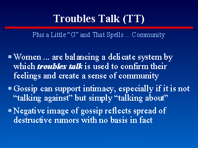 These points are paraphrased from pages 59, 96, 104 of Dr. Tannen's book. By "troubles talk," she means conversation in which one person's report of personal troubles is mirrored by another's report of similar troubles. By contrast, gossip is conversation about someone else in circumstances with which one has no direct, personal knowledge. In legal terms, it is the difference between hearsay and eyewitness testimony, both of which are notoriously unreliable without corroborating evidence. In terms of knowledge management, by defintion, gossip is tacit knowledge, even when it is "documented" (e.g., printed in the tabloids or gossip pages) because it is unsubstantiated. Gossip that has in fact been substantiated by incontrovertible evidence ceases to be gossip. Dr. Tannen suggests that non-destructive gossip is not only acceptable but perhaps even essential to intimacy and a sense of community.