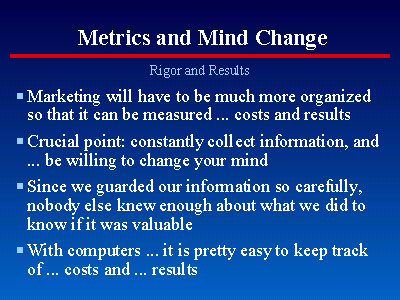 More from Zyman, pp. 7, 8, 43 & 44. These points are equally applicable to government services. However, for them to be realized in the government "marketplace," minds and cultures will need to change. Technology must be more fully and productively employed to manage the records created in the business processes. It is especially easy to keep track of costs and results if all documentation is managed in an electronic document/records management system in which the appropriate metrics associated with each record are captured as metadata. The difficulty agencies have had implementing the Government Performance and Results Act (GPRA) has little to do with technology and everything to do with cultural issues.