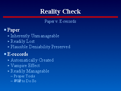 At a symposium sponsored by FIRM, Ken Withers posited the Vampire Effect and referenced the Spectre of Spoliation. The Vampire Effect is the difficulty of getting rid of E-records, since "deleting" them does not render them unrecoverable and, if they have ever been made available to others, the problem is compounded by the number of different hard drives upon which they have existed. The Spectre of Spoliation refers to the deliberate attempt to hide or destroy records, other than through lawfully and procedurally sound means. Electronic systems automatically create records. Once created and particularly if shared, they are not easy to get rid of with assurance. However, if the proper tools are used, they are easily managed. What is commonly lacking is the will to do so.