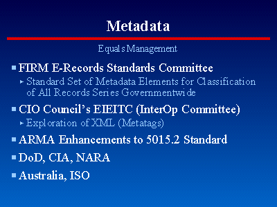 These are some of the hopeful activities underway. As most of you probably know, FIRM is the Federal Information and Records Managers Council. The FIRM E-records Standards Committee is striving to specify a standard set of metadata by which all records series should be classified, Governmentwide. The CIO Council's Interoperability Committee has tentatively agreed to look into how best XML might be employed, e.g., to assist with implementation of a record series classification metadata standard. Meanwhile, as you know, ARMA is pursuing enhancements to the 5015.2 standard. DoD and the CIA are also deliberating enhancements. What NARA is doing remains a bit of a mystery. However, commenting on the refusal of the Supreme Court to hear the appeal of the GRS-20 litigation, the National Archivist said that NARA has already moved beyond what would have been required if the district court's decision had been upheld. So let's take him at his word and act accordingly. Finally, Australia has proposed an international standard. And it is worthy of note that OMB Circular A-119 charges U.S. federal agencies not only with using but also helping to develop voluntary consensus standards, including international standards.